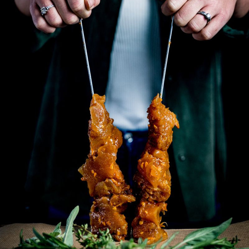 Onze varkenshaassaté wordt gemarineerd en geregen op een stalen pen. Gemaakt van het zachtste deel van het varken, met fijne structuur en topkwaliteit vlees van Wroetvarken (Piétrain-ras) of Ibéricovarken.